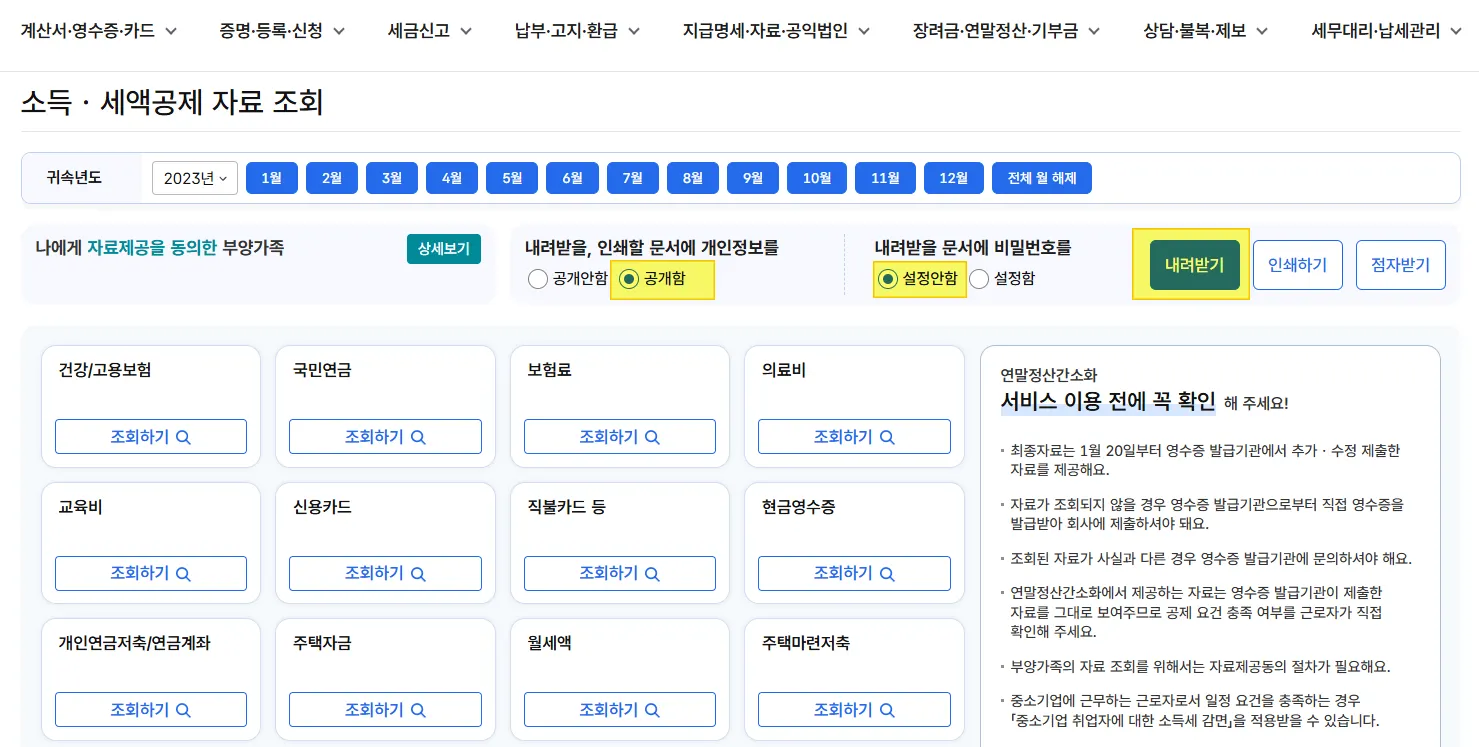 2) 근로소득이 발생한 월만 체크 > 내려받기